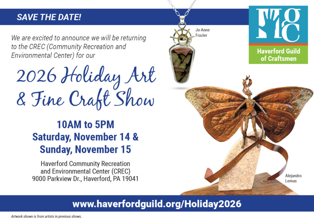 The Haverford Guild of Craftsmen is now accepting applications for their 2026 Holiday Art & Fine Craft Show! This is an indoor juried event, featuring some of the finest arts and crafts in the Philadelphia area. HGC Fine Art & Craft Shows attract visitors from Philadelphia and its surrounding counties, New Jersey, Delaware and beyond. Our patrons represent an educated and affluent demographic with a taste for exceptional artwork and a sensibility for supporting local businesses.